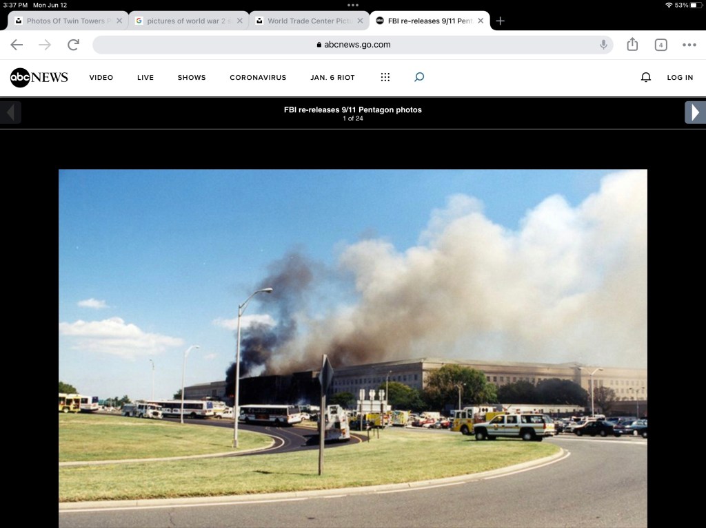 My son, who lived in Georgia, had been trying to call me to find out about my sister. He knew who she worked for, but didn’t know her location and feared that she might have been in the Pentagon. He somehow got through to me, and I reassured him as I continued my slow drive toward her office. When I finally got there, I found a vacant metered parking space in front of her building, and automatically pulled out change to feed the meter. But the slot was jammed by a coin, which explained why the space was vacant, and for a moment I worried that I might get a ticket if I parked there. Then I came to my senses. What police officer was going to be checking parking violations today? Didn’t they have better things to do? Duh! (Final note: I did not get a ticket.)