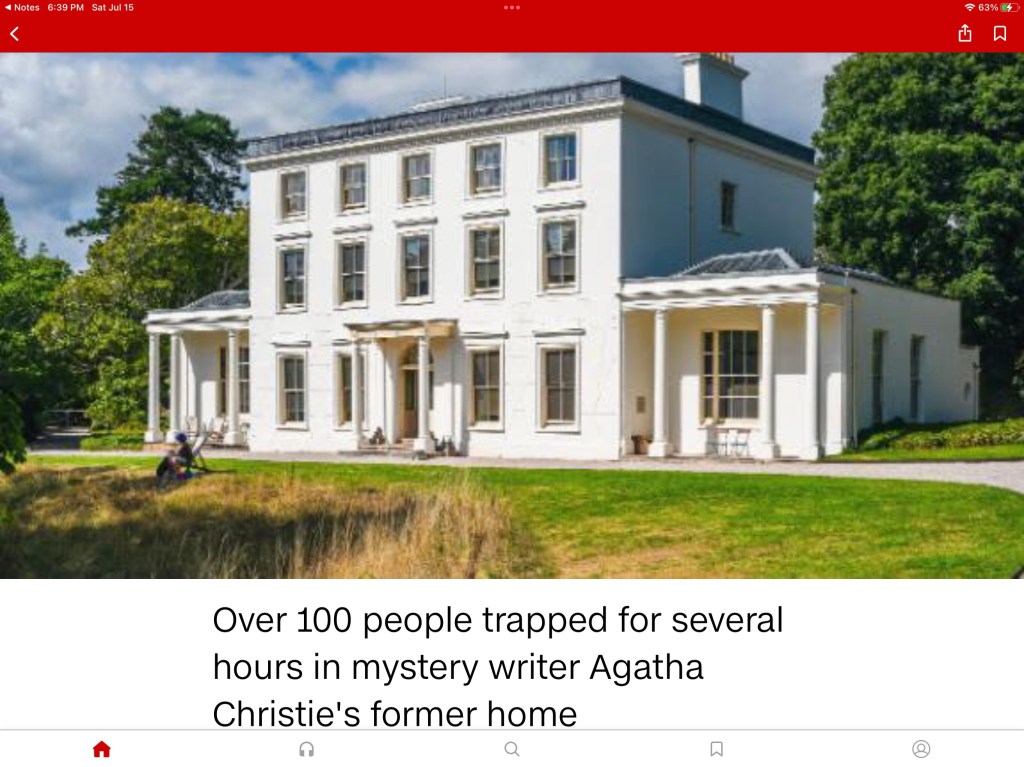 There was an article in the news yesterday about a group of around 100 tourists who were trapped for a few hours inside the British home of the late, great mystery novelist Agatha Christie. It seems the one access road to the house had been blocked by a tree knocked down in a storm while the group was touring the house.