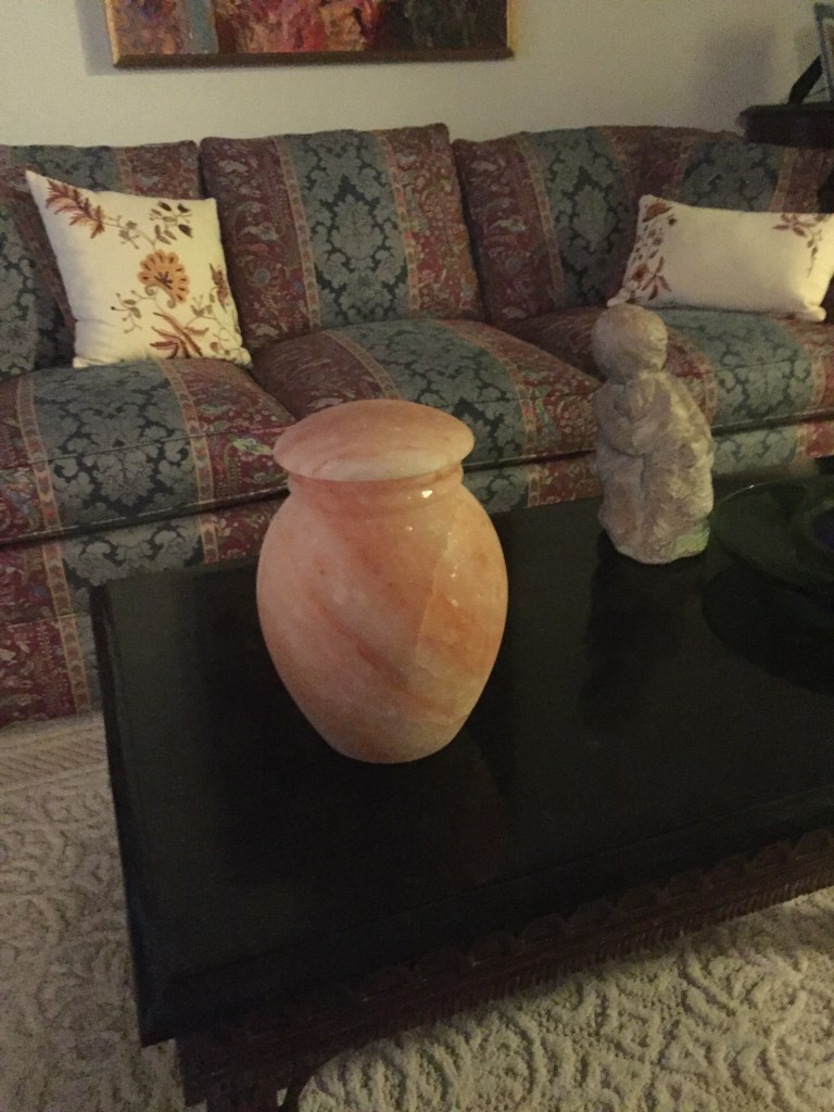 There was one item that took pride of place in my move: not in the moving truck, not even the rear of the big van we packed full and drove to my new home, but the front part of the van, closer to me and carefully wrapped in a mile of bubble wrap. That was a big, incredibly heavy urn made of pink Himalayan salt, which used to recline on my coffee table and now sits on a shelf above the fireplace mantle in the living room. It contains my sister Merna’s ashes — the one thing I cannot make myself part with. If that makes me an ash hoarder, or a crazy person, then so be it. But she and I had a “ribbit pact” — a name inspired by a little pillow we each had, depicting two frogs and the legend, “Together ‘til we croak.” And since I haven’t croaked yet, she’s not going anywhere either.