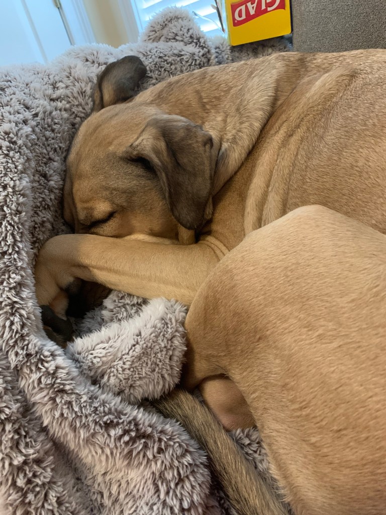 Dixie was a shelter pup — her DNA shows that she is part Staffordshire, part American pit bull, and part Golden Retriever. She has the best qualities of each breed: the protective instincts of the first, the tenacity of the second, and the loving loyalty of the third. She is incredibly smart and mostly obedient, but relentless in her appeals for food or play or scratches. At almost four years of age, she is alternately a big ball of energy — not as inexhaustible as a Border Collie, certainly, but trying hard for second place — and a champion napper, curling up in the most improbable positions.