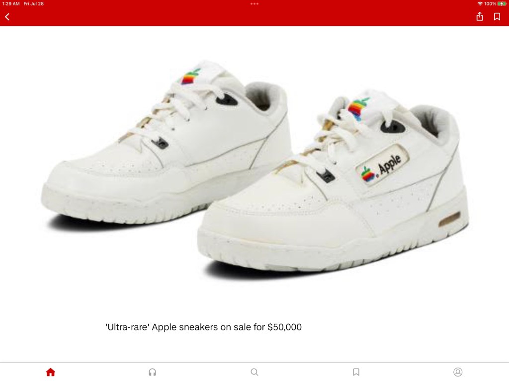 Did you know that in the mid-1990s, Apple (yes, that Apple) briefly veered from its exclusive focus on technology and commissioned a custom-produced, one-time-only line of white trainers, complete with the rainbow Apple logo on the tongue and side, to be given away to their employees at a national sales conference? Or that one pair — the one shown above — slipped through the cracks and was never distributed, or worn?