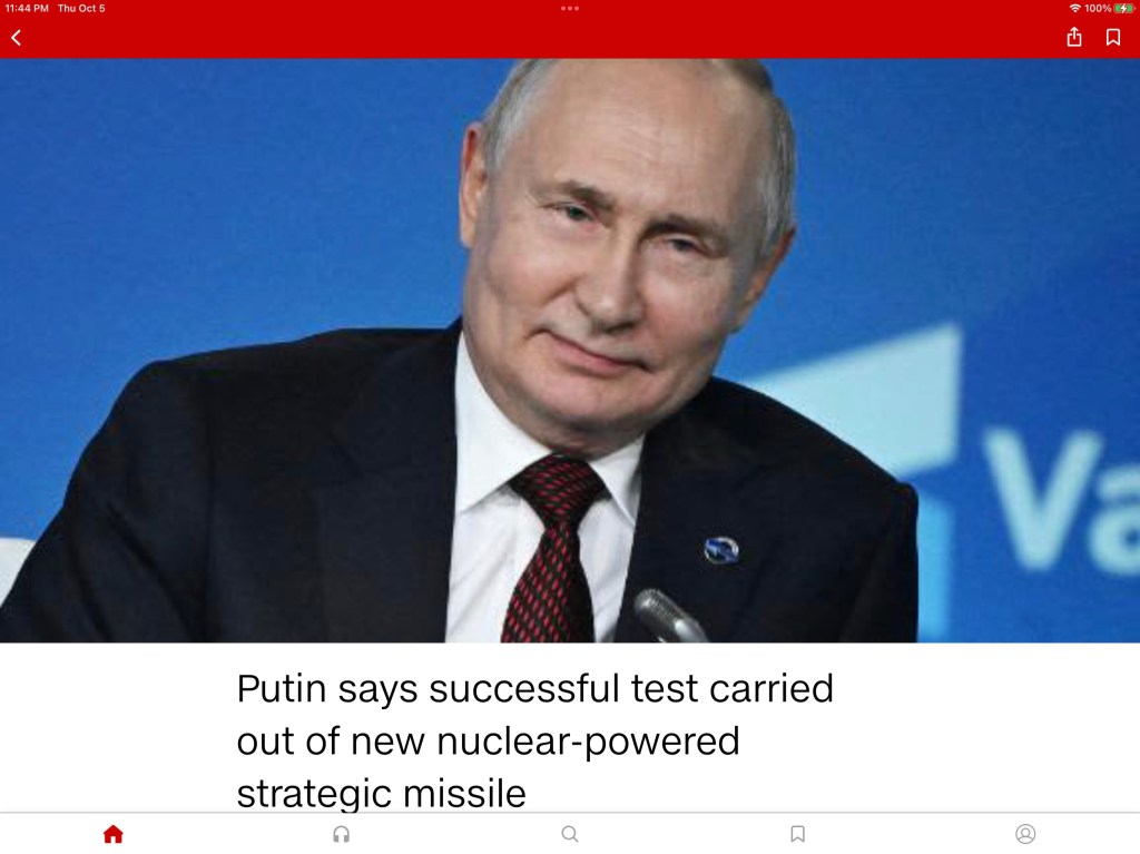 Okay . . . now I see the connection. In March of 2018, it — the missile, not the bird — was described by Vladimir Putin as “a low-flying stealth missile carrying a nuclear warhead, with almost unlimited range, unpredictable trajectory and ability to bypass interception boundaries.” So they’re both — the birds and the missiles — basically killing machines that swoop in and terminate anything and everything in their path. And I really don’t know how I feel about that “unpredictable trajectory” thing. Plus, to cap it off, in 2019 the Nuclear Threat Initiative (NTI) quoted Russian military expert Alexei Leonkov as describing the Burevestnik thus: “a weapon of retaliation, which Russia would use after Intercontinental Ballistic Missiles to finish military and civilian infrastructure and not leave a chance of survival.” [All quotes from Tim Lister and Sergey Gudkov, CNN, October 5, 2023.]