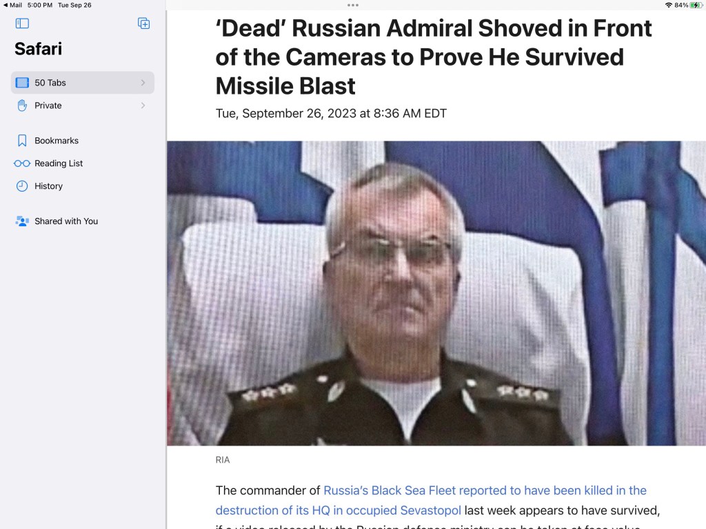 Admiral Viktor Sokolov. Once the commander of Russia’s Black Sea Fleet, Sokolov had the misfortune of being in their headquarters in Sevastopol, Crimea, when a Ukrainian missile found its target and destroyed the building. There were reportedly 34 senior officers killed in that attack, but no one seemed to know whether Admiral Sokolov was among them — or if they knew, they weren’t saying. But a couple of days later, he made a cameo appearance in a video of a meeting of Russian brass, looking oddly wooden, eyes closed behind his glasses, uniform shirt open at the neck and with no tie . . . and propped up against some sort of pillow. A few days later, a still photo of him was also released. And after that . . . nothing. So, once again, is the Admiral dead or alive? Were those pictures real or fake? Anyone? Still waiting . . .