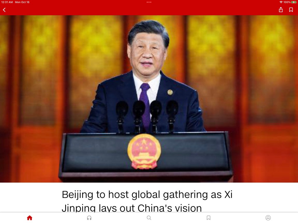 For the first time since beginning its isolation during the Covid pandemic, China is hosting a gathering of world leaders in Beijing this week. The goals: to pat itself on the back for its role in economic development around the world during the past decade, and to “project its expanding ambitions as an alternative global leader to the United States.” [CNN World, October 15, 2023.]