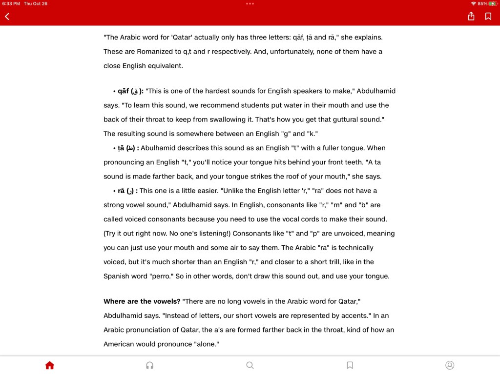 She began by telling me something I already knew, which was that most English speakers will pronounce “Qatar” something like “kuh-TAR.” This, of course, is what I had always done until fairly recently, when I heard from some so-called expert that it should be pronounced more like “cutter.” That never sounded quite right to me, but hey, it’s the Qataris’ name, not mine, so who am I to disrespect them?