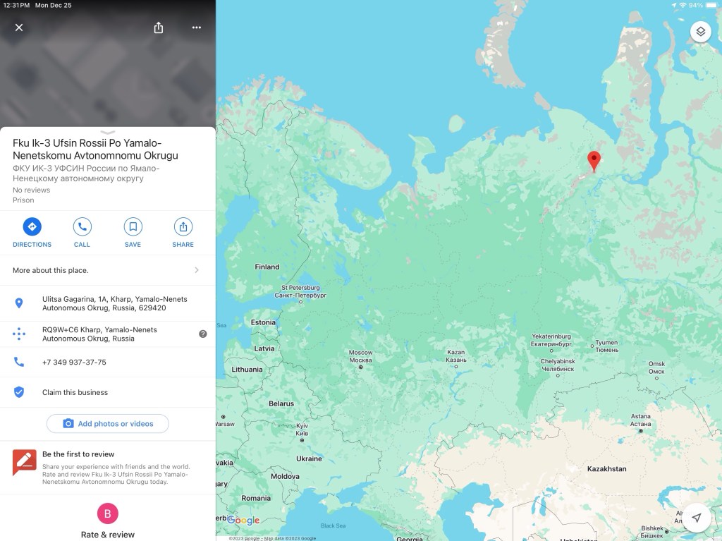 Because the bad news — the very bad news — is that he is now being held in Russian penal colony IK-3, located 40 miles above the Arctic Circle in the settlement of Kharp in the Yamal-Nenets Autonomous District, some 2,000 miles north/northeast of Moscow. Popularly referred to as “Polar Wolf” due to its harsh conditions, both natural and man-made, it appears to be as isolated a spot as the authorities could find for Putin’s principal political opponent. If you really want to shut someone up . . . where better than a Siberian former GULAG camp?