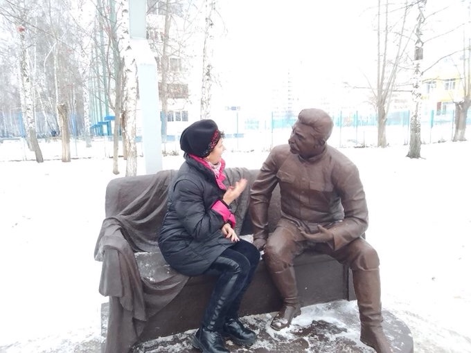 In addition, an estimated 100+ statues and monuments to Stalin, many newly installed, dot Russia’s massive landscape. One in particular — in the Tatarstan region of Naberezhnye Chelny — stands out as unique. There is a bench that resembles a sofa, with a sculpted “blanket” draped over the back and one arm. Seated on one end of the bench is the figure of Comrade Stalin, seemingly engaged in rapt conversation, visually inviting passersby to sit down and have a chat with him.