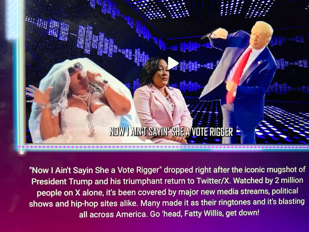 The video is credited to a group known as Dilley Meme Team: “online content creators independent from the Trump campaign, though they work in close contact with it. The group — which calls itself Trump’s Online War Machine — has faced controversy for its vulgar and sexist content.” [Samuel Benson, Deseret News, Jan. 8, 2024.]