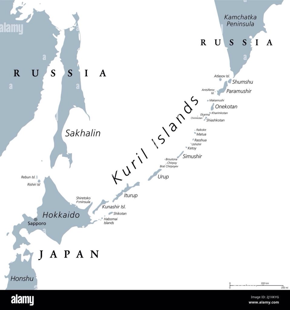 The history of the islands is long and complex — they’ve changed hands back and forth more times than a tennis ball at Wimbledon. But Russia currently occupies and maintains tight control over them, and Japan wants them back . . . or more particularly, the four southernmost islands, the ones closest to Hokkaido, which include two of the largest of the chain. And Russia’s not about to budge. They took those four — and a good bit more — at the end of the war with Japan in 1945, but Japan continues to claim that they’re part of their country “as they have always been visible with the naked eye from the Japanese island of Hokkaido and appear on centuries-old maps of Japan as being part of Japan.” [Russian Analytical Digest, July 2020.]