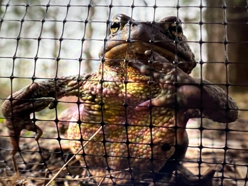 Ooh, no-o-o-o-o-o!!! Froggy prison! No crossing the road for you, big fella. No little girl toad waiting anxiously for her lover boy to show up in that boggy bordello by the boulevard. And no conjugal visits in this prison colony either. If only you’d taken my advice and kept your big mouth shut, you could be a proud papa by now. And so, I can’t resist saying it: