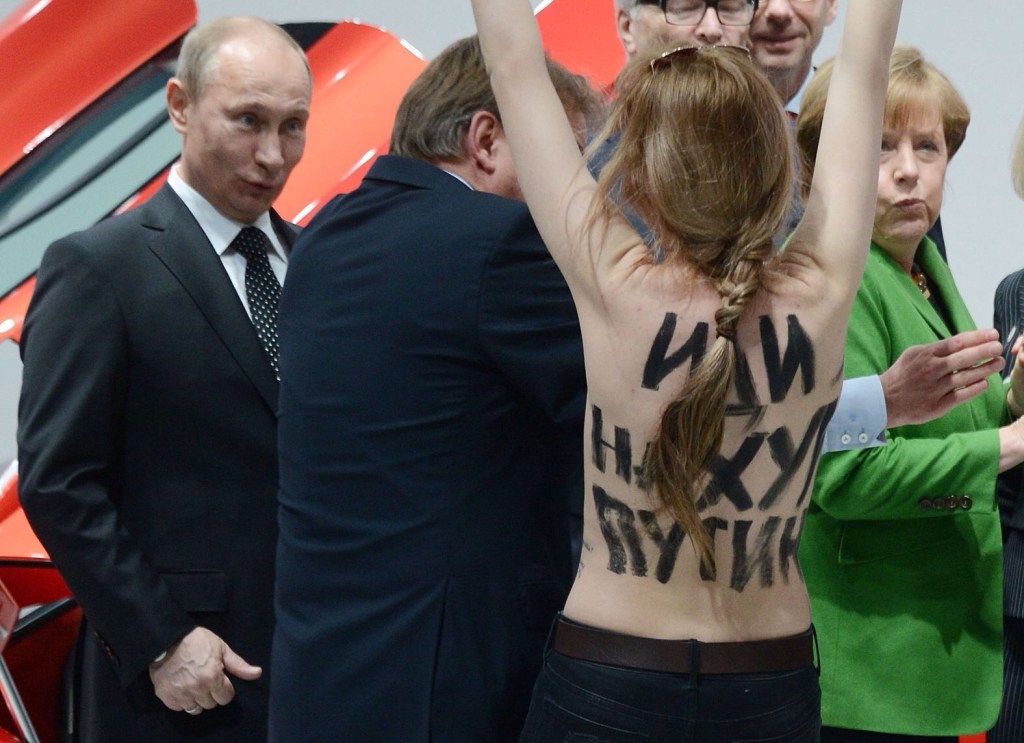 * If you must know — although the very end of the second word is not visible — I’m quite certain the writing on the young woman’s back says “F*ck off, Putin.” But it’s not her back he seems to be focused on.