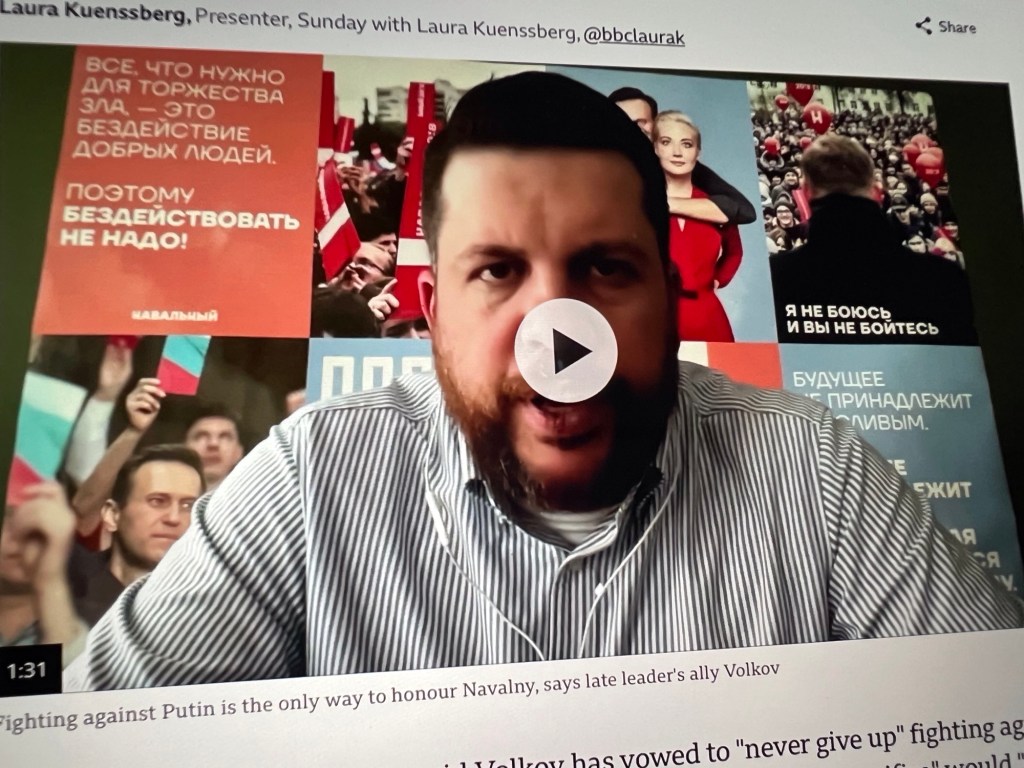 I have included here a screen shot of Leonid Volkov, taken during his BBC interview, in order to call attention to the sign over his right shoulder (upper left corner of the picture). It contains a familiar — and most apt — quotation that none of us should ever forget: