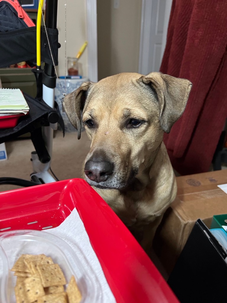 Well, after a day of listening to her saying hello to every passing living being, things finally quieted down in the neighborhood for the evening. Since two of our family of four (humans) were away for the week, and my son was working in his home office, I was enjoying a quiet dinner on a tray in my den while watching one of my favorite movies. Until Dixie started her food vigil. (And yes, she had already had her dinner.)