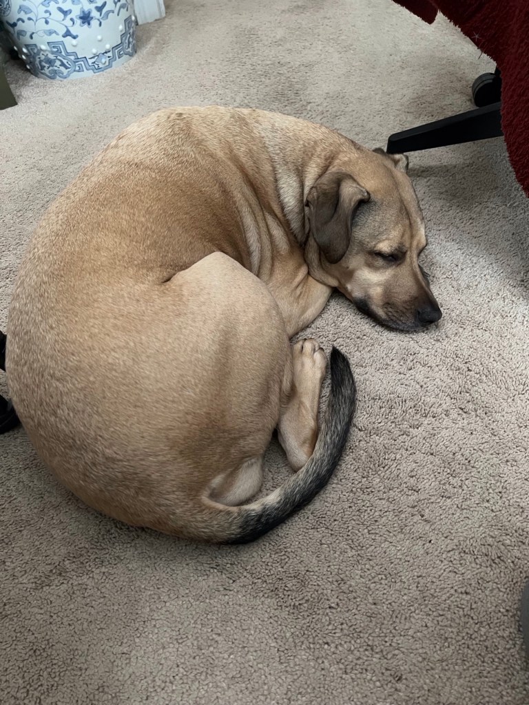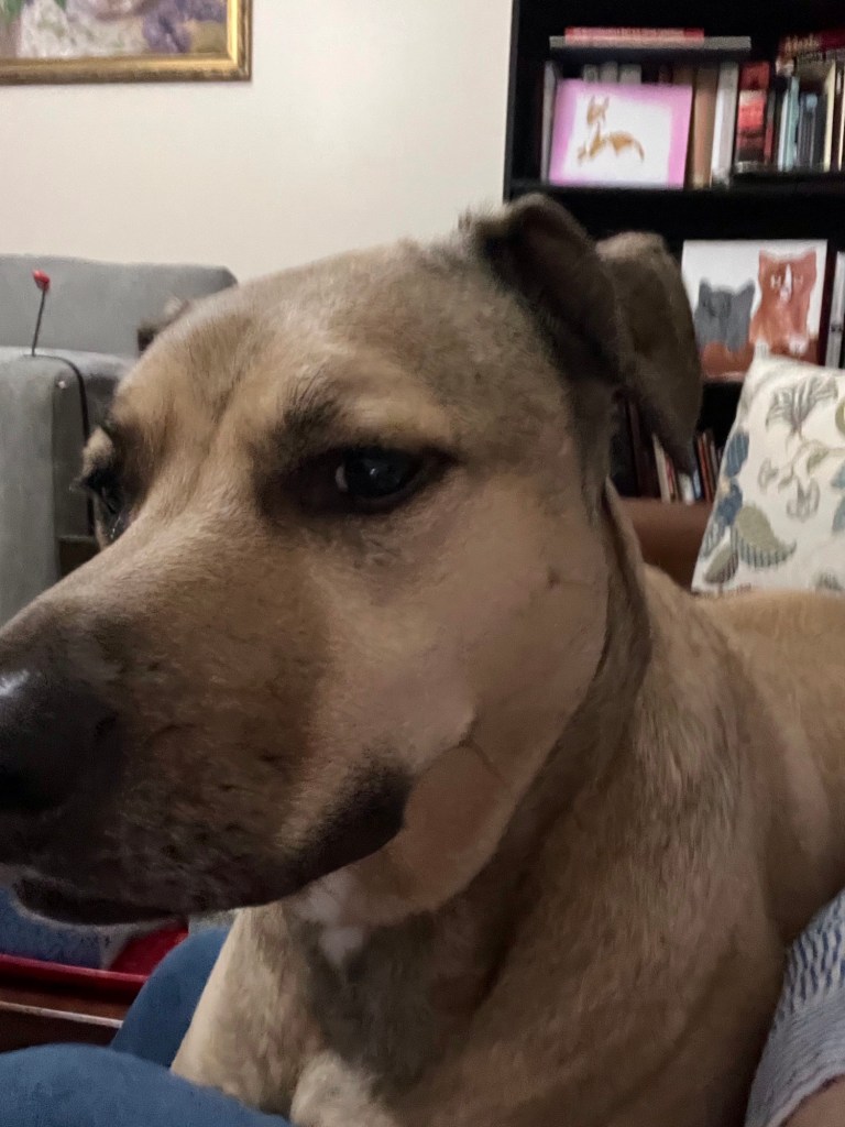 It all started yesterday, as it always does, with her protective instinct kicking in. If anyone or anything — deer, rabbit, neighbor, UPS truck — comes within 100 yards of the house, she goes bonkers. She’s a medium-sized mixed-breed: part Staffordshire, part pit bull, part lab, according to her DNA test results. So one would think she’d be in attack mode when she reacts that way. But let her at any of these creatures, human or otherwise, and rather than trying to tear them apart, she’ll just lick them to death. This girl is a lover, not a fighter. So, from my point of view, the barking serves no useful purpose other than to make Dixie happy.