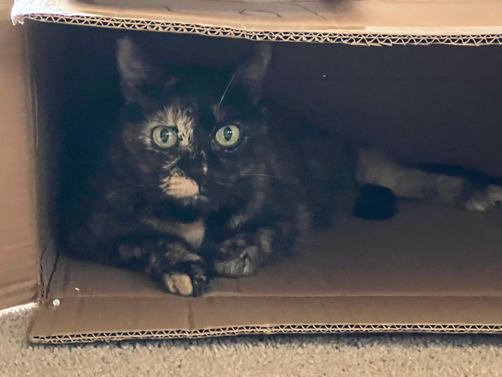 And while all of this was going on, the cat was thoroughly enjoying the spectacle from her ringside seat. (She has a kitty condo, but — like most of her ilk — prefers the box from the latest package delivery.) What I wouldn’t give to know what she was thinking!
