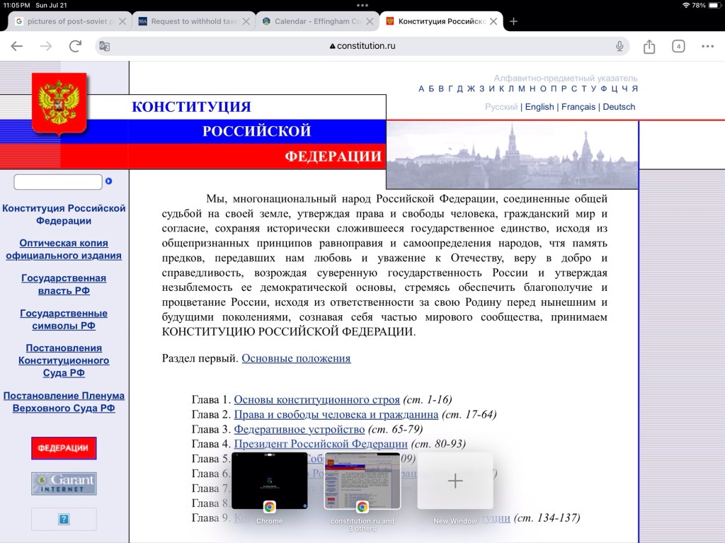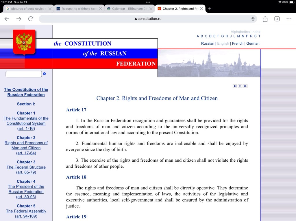* Please note here that I started reading an English translation of the Russian Constitution, which was apparently not done by a native English speaker. It was rather confusing in places, and I’m trying to find a better translation; otherwise, I will have to spend a year struggling through the original, one phrase at a time, just me and my Russian-English dictionary. Oy!