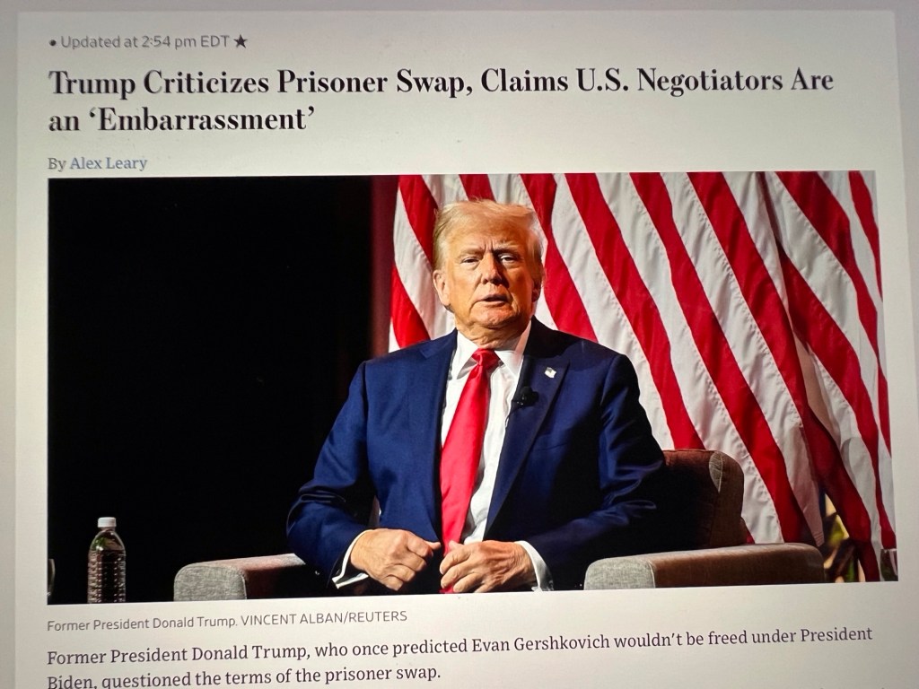 “So when are they going to release the details of the prisoner swap with Russia? How many people do we get versus them? Are we also paying them cash? Our ‘negotiators’ are always an embarrassment to us! I got back many hostages, and gave the opposing Country NOTHING — and never any cash.” [Alex Leary, Wall Street Journal, August 1, 2024.]