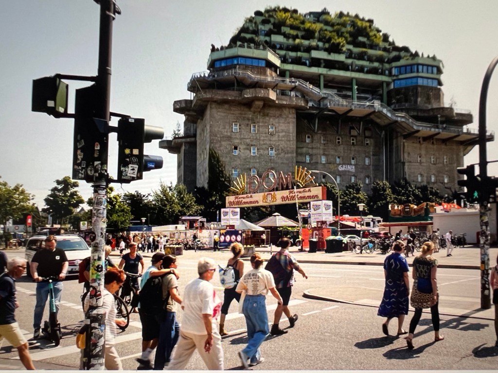 I do understand that it was just too huge, too solid to demolish. It would have required much too large a quantity of explosives in what is now a busy commercial area. The neighborhood, known as Karoviertel, “sits in a cool enclave filled with stylish coffee shops and vintage stores, plus the Knust nightclub in a repurposed abattoir.” [Maureen O’Hare, CNN, August 14, 2024.]