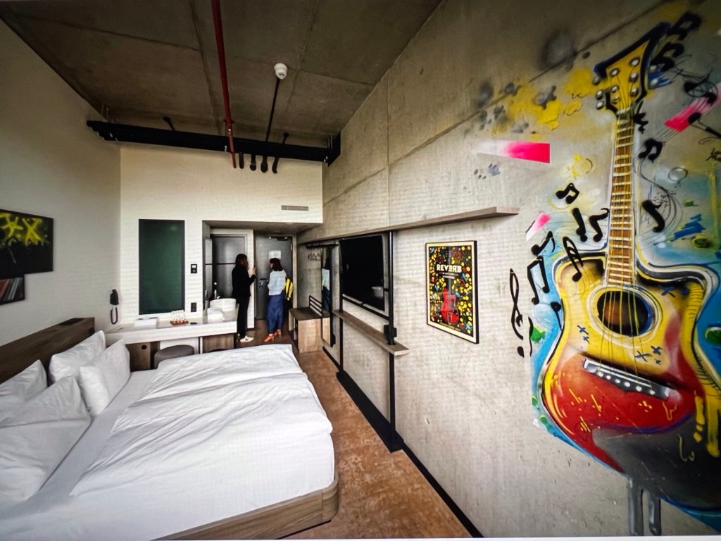 But back to the bunker. It now houses two restaurants, a rooftop bar and garden (the source of all that greenery), Constant Grind coffee shop and bar, and a five-story Hard Rock Hotel. Rooms range from 180 Euros (around U.S. $197) to 269 Euros (about $295). Amenities include a 55-inch flat-screen TV and Alexa in-room assistant.