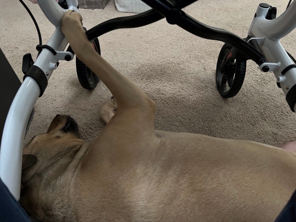 While Dixie, spoiled girl that she is, can often be found lying under my Rollator, waiting for her daily — or twice daily — “scratch,” which actually includes a full-body massage. And when I find exactly the right spot that needs a little extra work, like a shoulder or a hip, she’ll turn her head to look at me with gratitude, and give me air kisses.