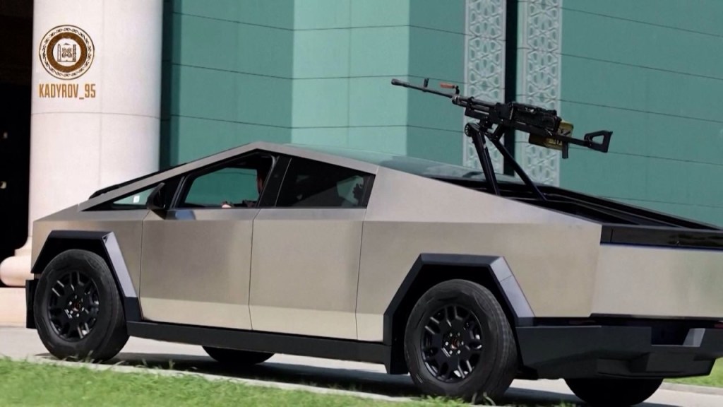 So imagine my surprise when I learned that Chechen leader Ramzan Kadyrov had taken delivery of a brand-spanking-new Tesla Cybertruck. And then, of course, gussied it up by mounting — in plain sight on the rear hatch — a real live machine gun. Because in Chechnya, you can do that. Then he published a video of himself driving the vehicle, which he says he plans to send to Russian forces on the battlefields in Ukraine. The truck, not the video. [Christian Edwards, CNN, August 19, 2024.]