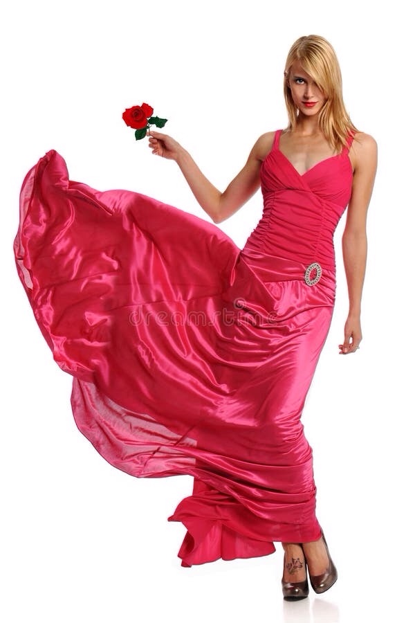 — Wearing a beautiful, slinky, sparkly, rose-colored evening gown with bare shoulders and “spaghetti” straps;
