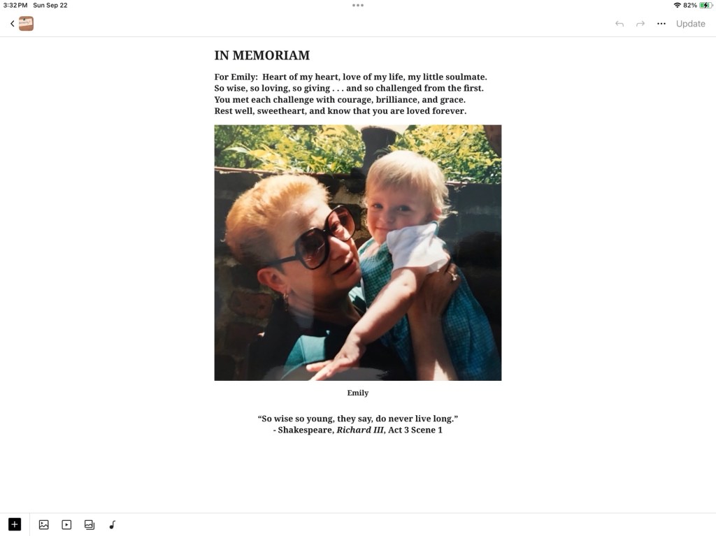 9/23/24: Happy 29th Birthday, Emi Leave a reply I can only repeat what I’ve said before: You are loved — and always will be — beyond measure. Love and a thousand xoxo,Nana Share this: Brenda’s Blog Share on Facebook (Opens in new window) Facebook Email a link to a friend (Opens in new window) Email Like Loading...