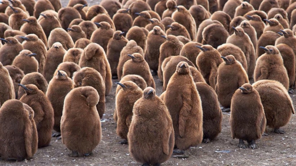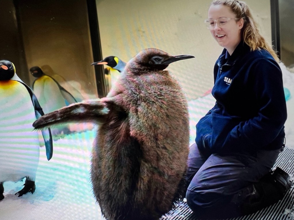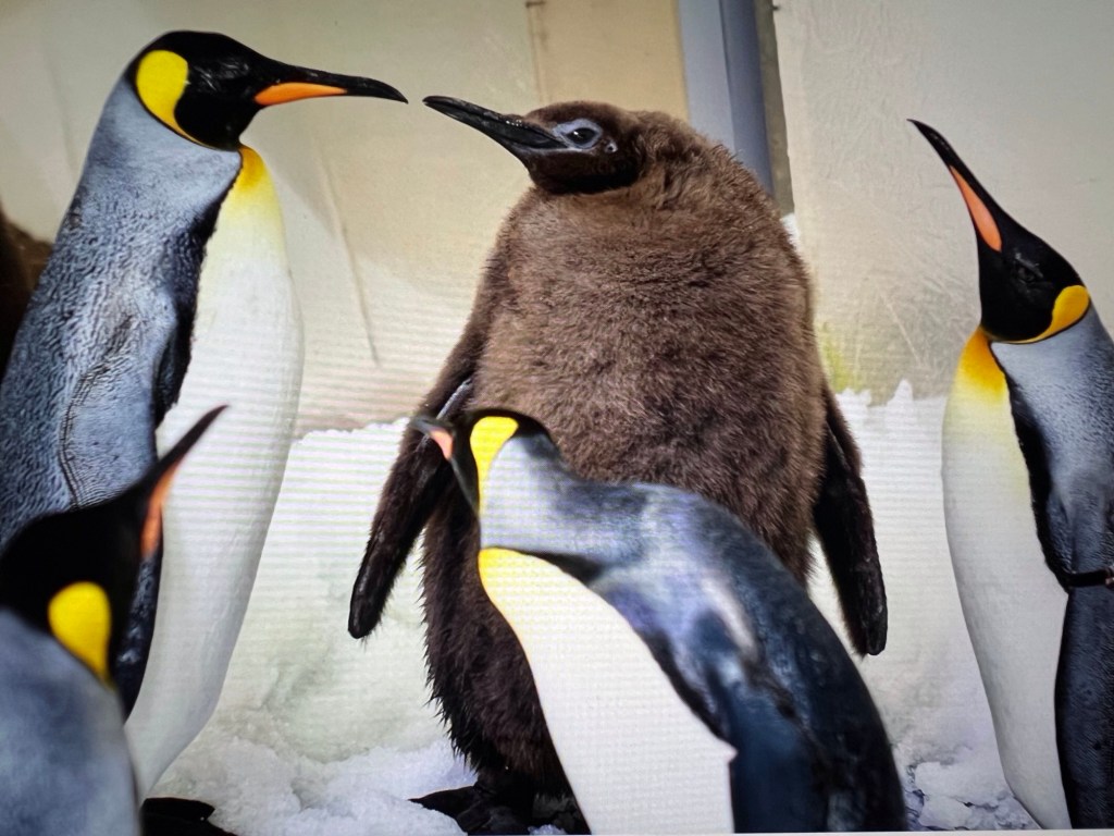 I love penguins — all penguins — and this big fellow has really stolen my heart. He’s just six months old, and it seems that, at three feet tall, he’s already looking down at his dad. The average height of a full-grown king penguin — the second-largest breed of penguin next to the emperor — is anywhere from 28 to 39 inches, usually reached at 14 to 16 months of age. So Pesto has at least another 10 months of growth to look forward to, and he’s already within three inches of the usual maximum height.