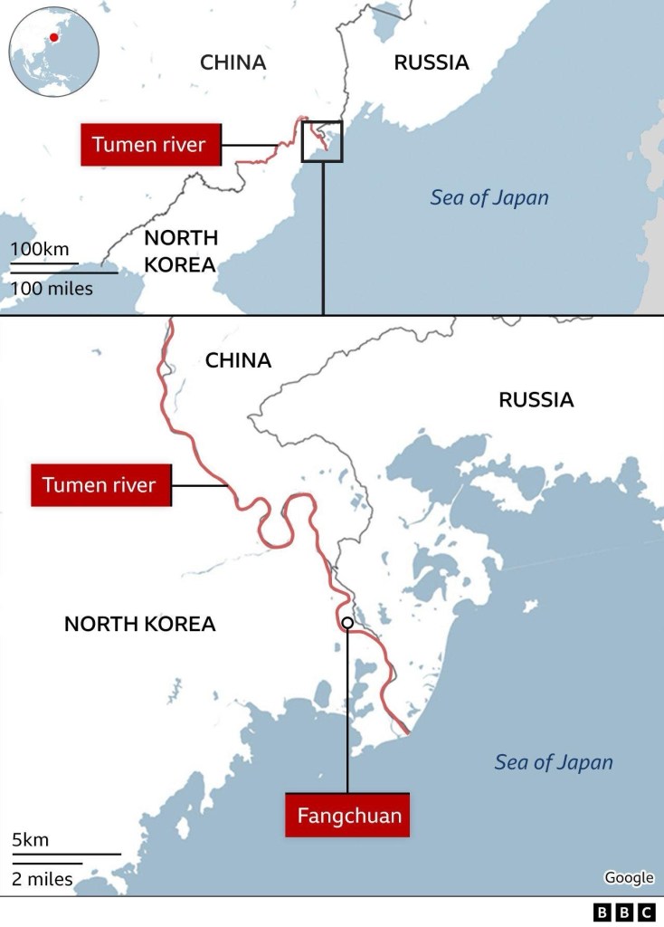 The nearest village is called Fangchuan, which, while located in China, is sandwiched between Russia and North Korea, and has become quite the local tourist attraction for its views of all three countries. [Laura Bicker, BBC News, November 2, 2024.]