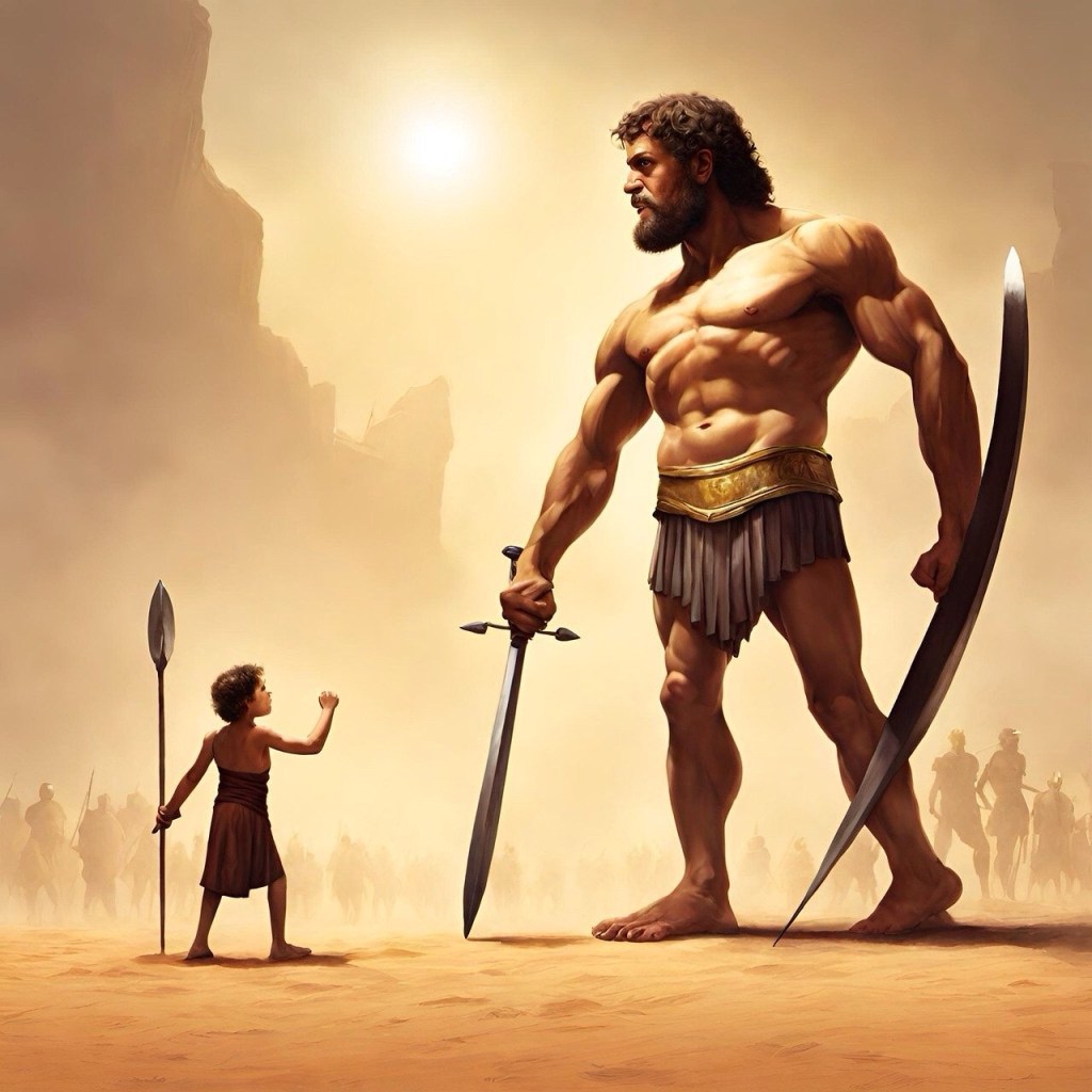 In the Bible, young David slew the mighty Philistine giant, Goliath, with a slingshot and stones.