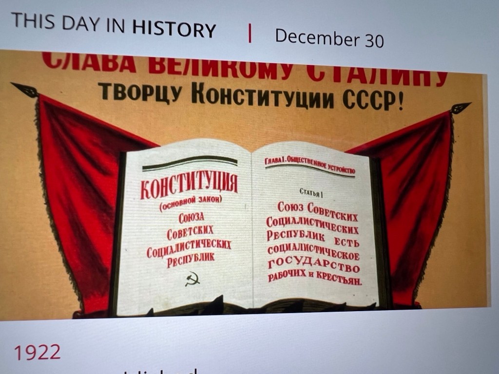 Or so it was said on this date in 1922, five years after the Bolshevik Revolution of 1917, when a confederation of Russia, Belorussia, Ukraine and the Transcaucasian Federation* entered into a treaty officially establishing the Union of Soviet Socialist Republics — or the more easily pronounceable Soviet Union — and rendered the Russian Empire extinct.