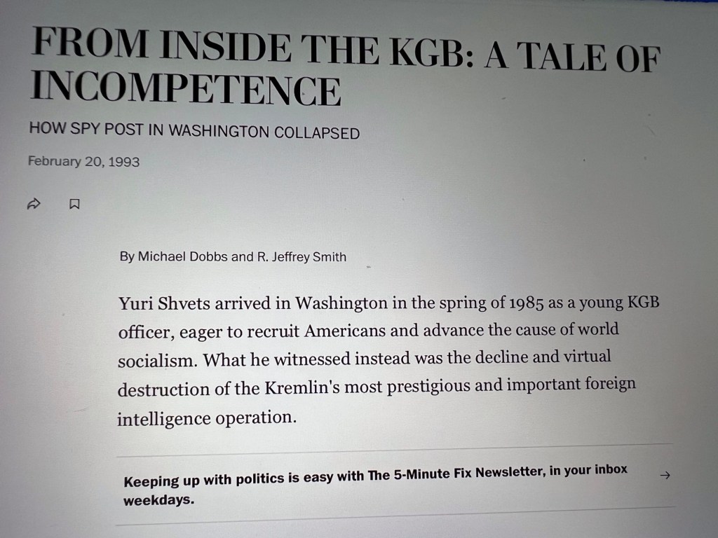 Feeling much better, I immediately fell into my usual Sunday routine of opening the front door to retrieve the Washington Post, dropping the paper on the kitchen counter, and reaching for the orange juice in the refrigerator. But a headline had caught my eye, and I turned back for a second look. What I had seen were the letters “KGB.”