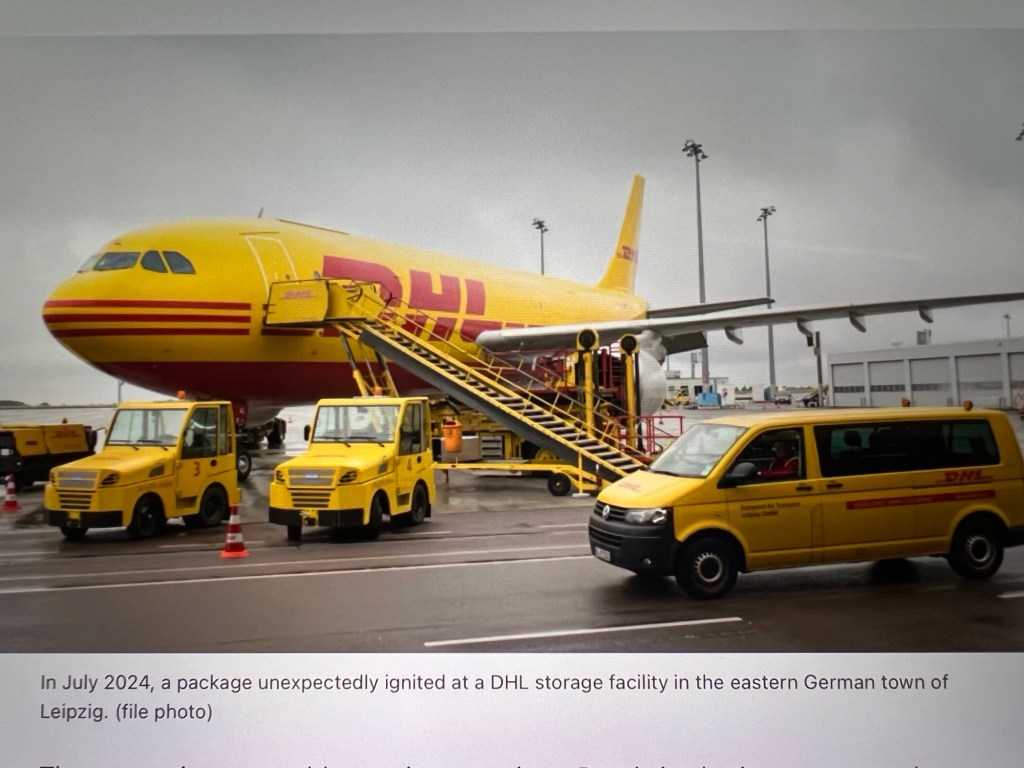 — In the eastern German town of Leipzig, a package shipped from Lithuania suddenly ignited at a DHL storage facility. The fire was quickly extinguished, and damage was minimal.