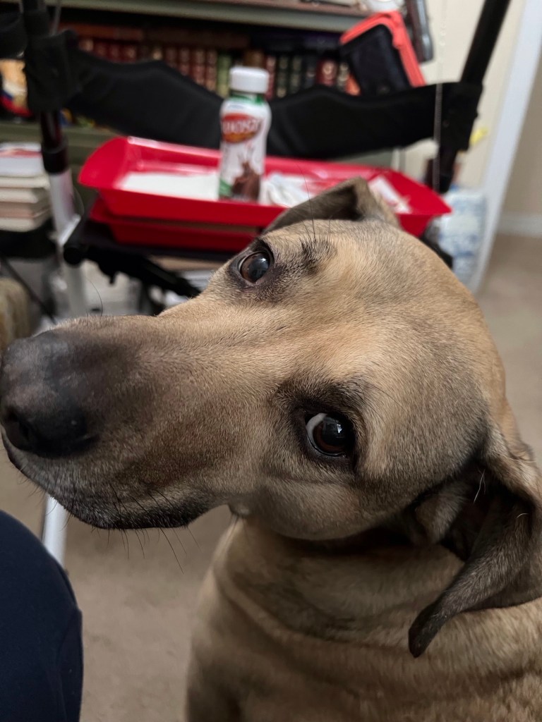 Anyway, my eyelids had finally begun to droop. So I gave her the three pats on her rump that signal I’m finished rubbing and scratching for now, and she got up and walked out . . . turning, just as she reached the doorway, to give me her “thank you” look. And I took myself — pajamas now amply strewn with dog hair — back to bed, where I finally, miraculously, managed to score four and a half hours of sleep and no fewer than three bizarre dreams.