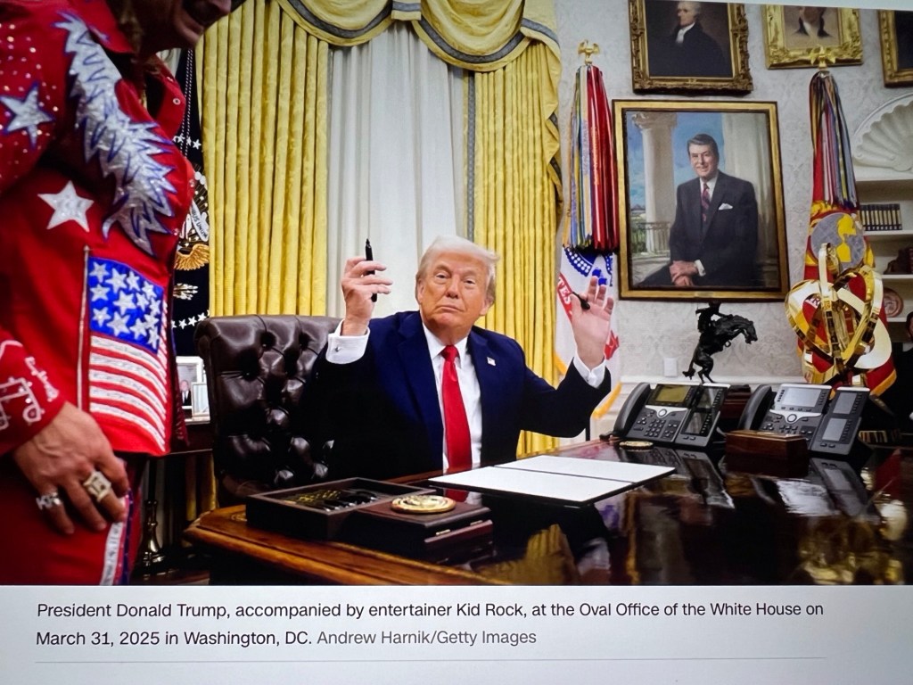 Now, I don’t know anything about this “Kid Rock” — he may be a perfectly nice guy. But what the hell is he doing hanging around the Oval Office as though he belongs there . . . and looking like an escapee from a Barnum and Bailey circus?