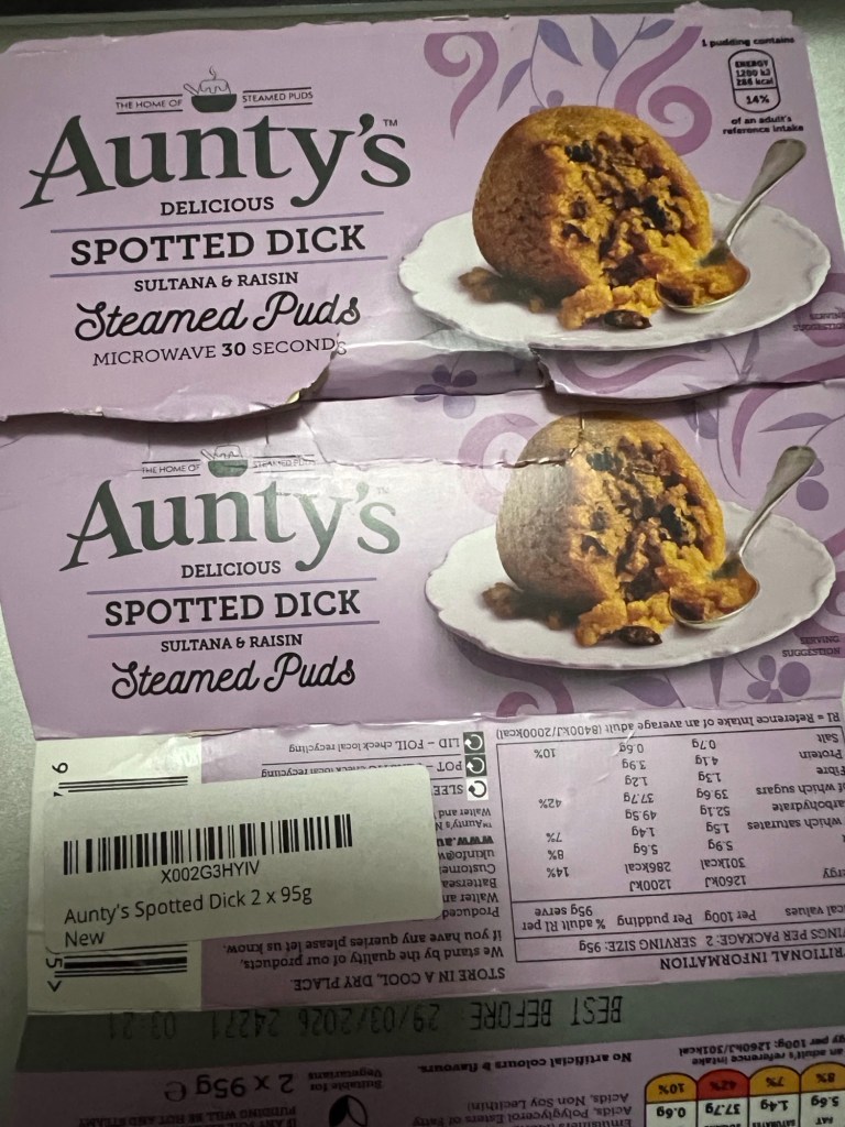 Anyway, I was delighted to find that Aunty has a Spotted Dick (restrain yourselves, please), and I hastened to order just a single two-pack to satisfy my curiosity. When it arrived the very next day, I read the package, which turned out to be an education in itself.