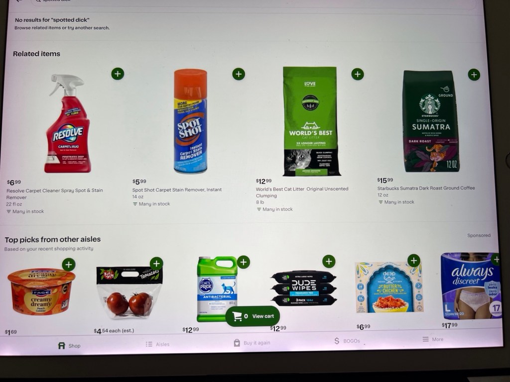 I thought about trying the “Creamy Dreamy” just for fun, but got hung up on wondering what twisted artificial intelligence thought the Spot Shot stain remover, Cat’s Pride kitty litter, extra-large Dude Wipes (use your imagination), and Always Discreet incontinence panties might be in the same category as a sponge pudding. (“Sponge,” by the way, being Britain’s name for a light, airy cake, which actually does make sense.)