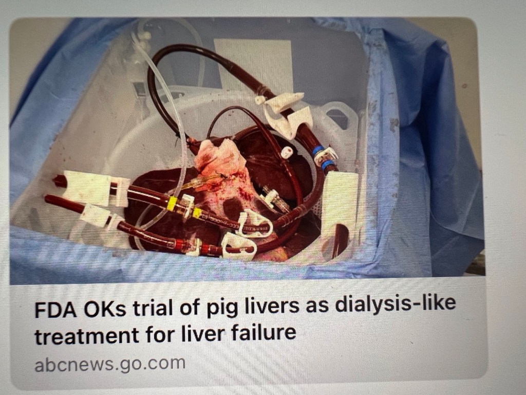 I’ve just read about a potentially history-making procedure, still in the research stage, that would enable a person with sudden liver failure to be temporarily kept functioning by being attached to a genetically-edited pig’s liver in a dialysis-like treatment, while awaiting a suitable transplant. The process would filter the person’s blood, doing the work of their own liver so the organ could rest and possibly heal itself. [Lauran Neergaard, ABC News, April 15, 2025.]
