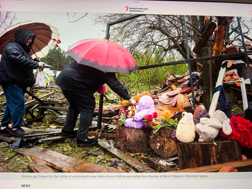 In one demolished home in the Zhytomyr region — the area from which my maternal grandparents emigrated to the U.S. in 1905 — three children were killed in the early hours of the morning.