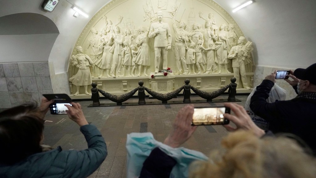It is said to be a gift to the people of Moscow from the city’s metro system to mark its 90th anniversary, and has been welcomed with joy by some passengers, as indicated by the red carnations placed at Stalin’s feet.