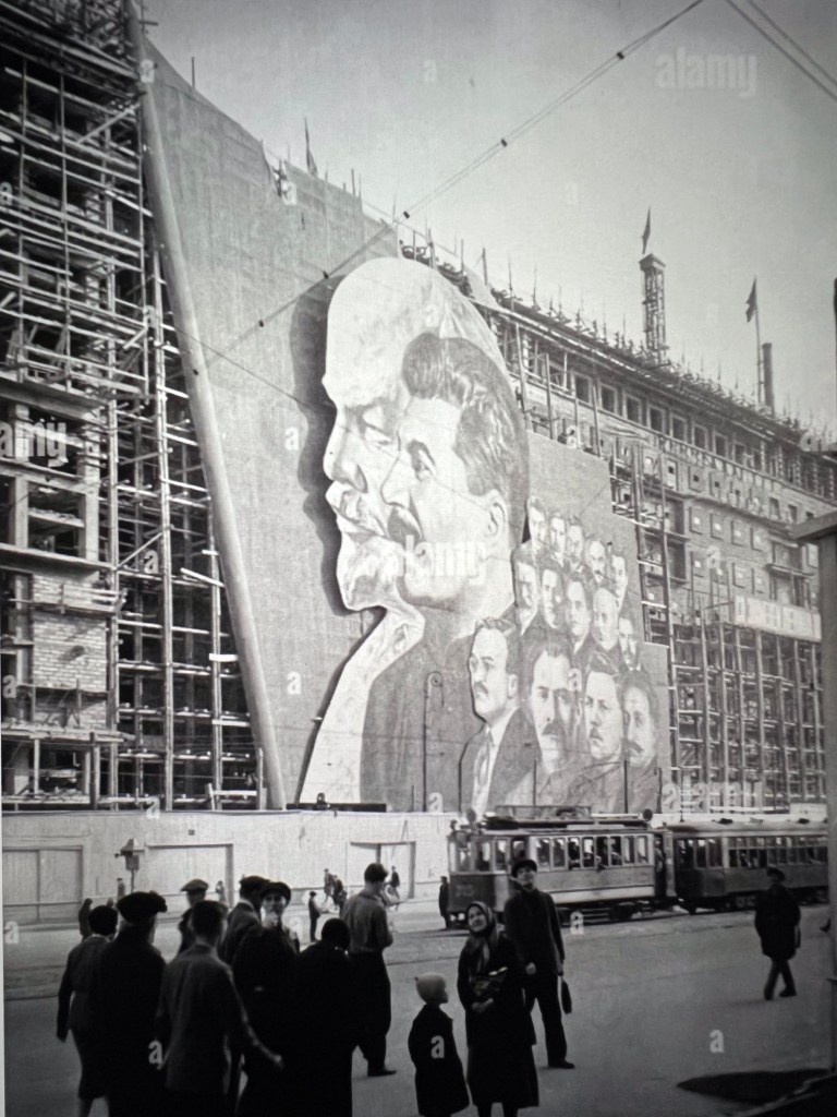 They are photos from mid-20th-century Moscow, USSR, when larger-than-life statues and posters of Soviet leaders were everywhere.