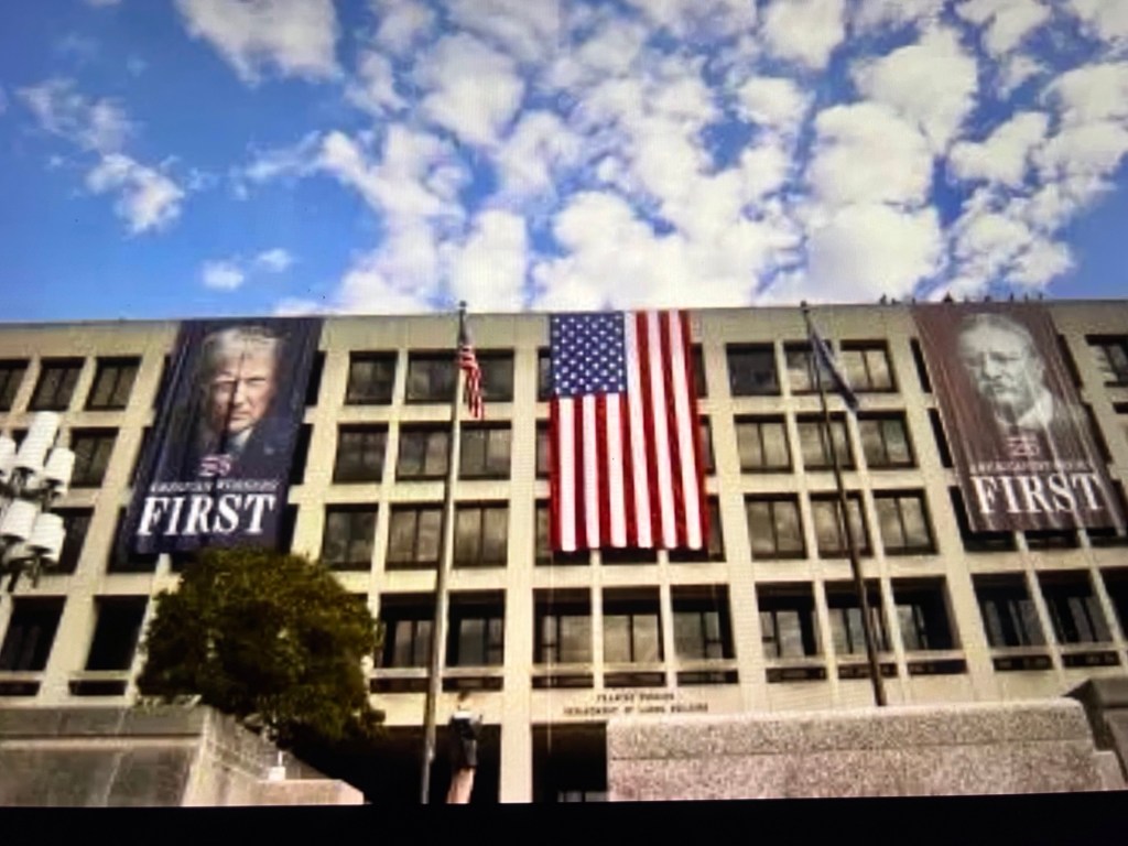 No, you’re not seeing things. And it’s not an AI-created picture; it is an actual photograph of the U.S. Department of Labor Building in Washington, D.C., sporting a gigantic poster of Donald Trump bearing the legend, “American Workers First.” And on the other side of the big American flag is a similar portrait of the renowned trust-busting President Theodore “Teddy” Roosevelt, with the same legend.
