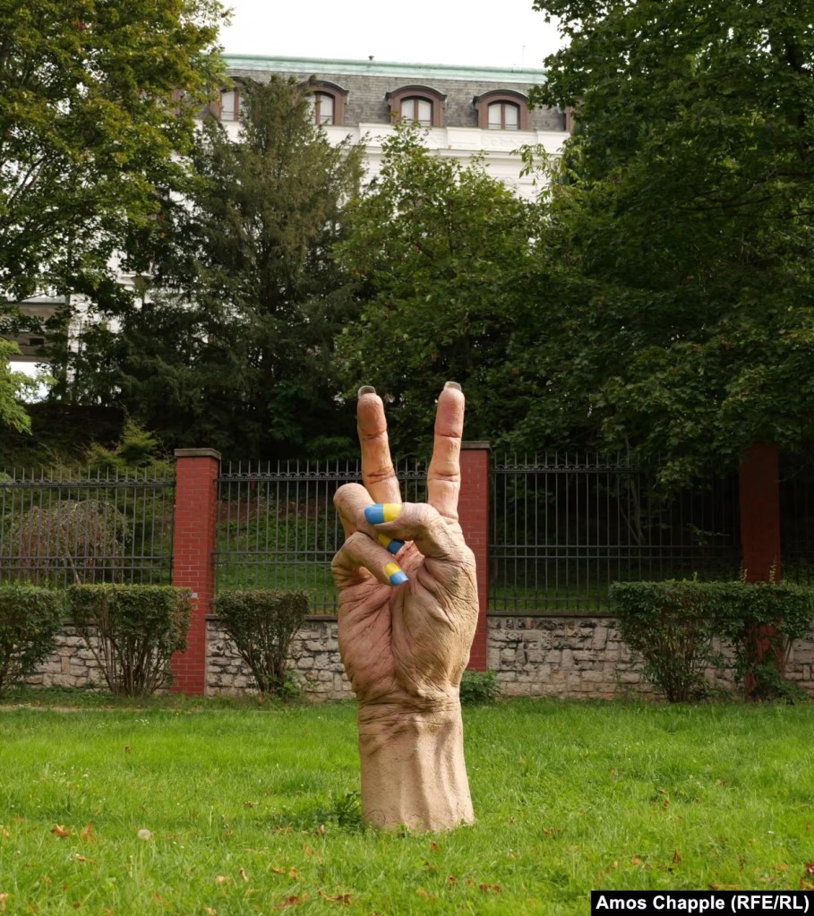 Then there is this sculpture by Jan Slovencik, installed directly outside the Russian embassy fence on Ukrainian Independence Day on August 24, 2022, depicting a “V” for “Victory” — with the Ukrainian national colors of blue and yellow adorning the fingernails: