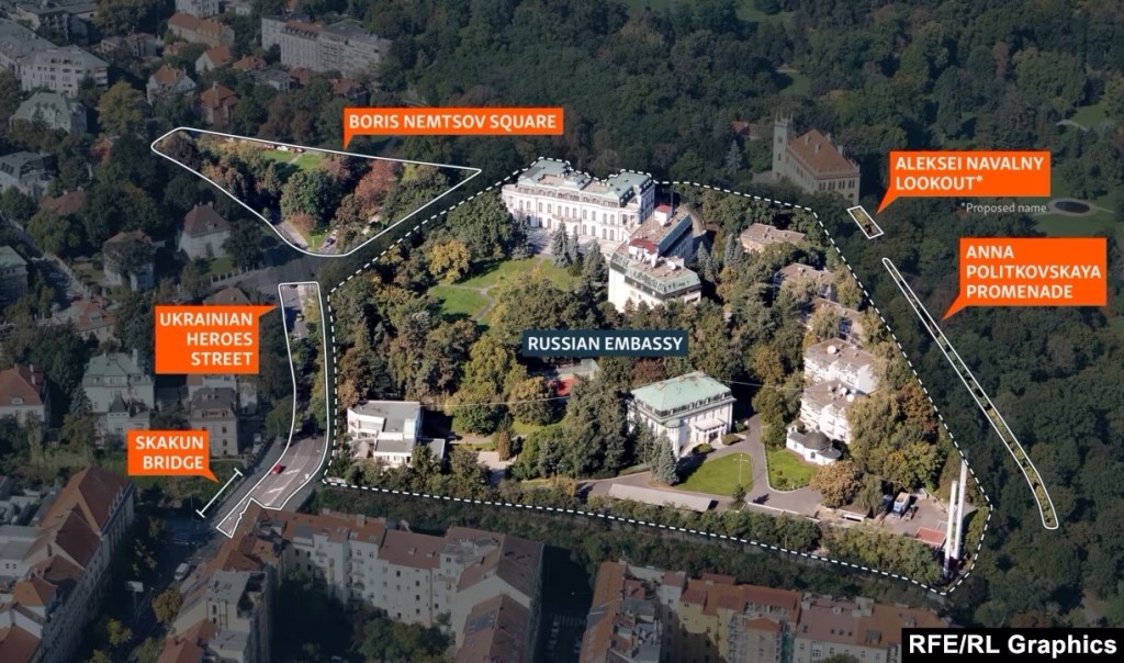 The embassy is located in a lovely area well outside the bustle of Prague’s historic Old Town. And Czech authorities began — even before Putin’s war made Russia an international pariah — renaming some of the surrounding streets and landmarks in honor of some of Putin’s most prominent victims.