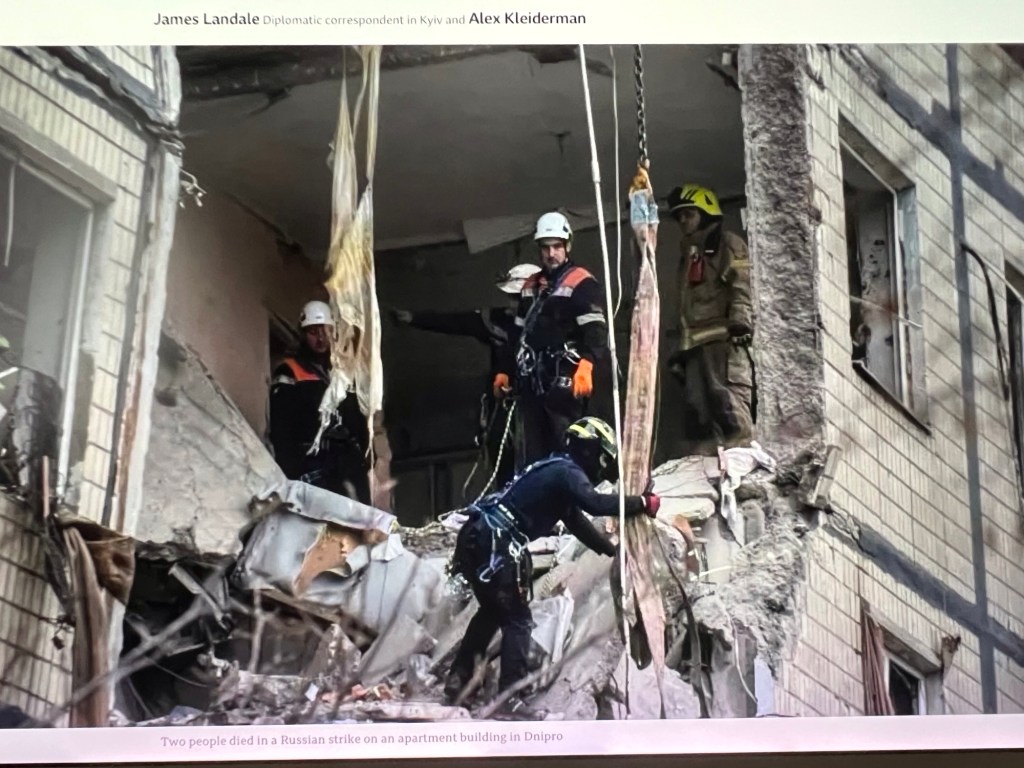 Despite international efforts at resolving the conflict, Putin has refused to agree to a ceasefire, and continues his deadly attacks day after day after day. Yesterday alone, Russia launched hundreds of missile and drone attacks on residential targets and civilian infrastructure in 25 locations across Ukraine, including Dnipro, Zaporizhzhia, Kyiv, Poltava, Chernihiv, Odesa, Kirovohrad and Kharkiv, in which at least six people were killed and countless thousands left without electricity, water, and — in many cases — without shelter against the coming winter. [James Landale and Alex Kleiderman, BBC, November 8, 2025.]