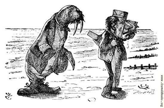 But how many know the rest of the poem, or the context in which that verse was written? In a nutshell, it’s a Pied Piper sort of tale, in which a Walrus and a Carpenter, walking along a beach, come across a bed of Oysters, all fat and ripe for the eating. They attempt to lure the mollusks along the beach with promises of a good time: