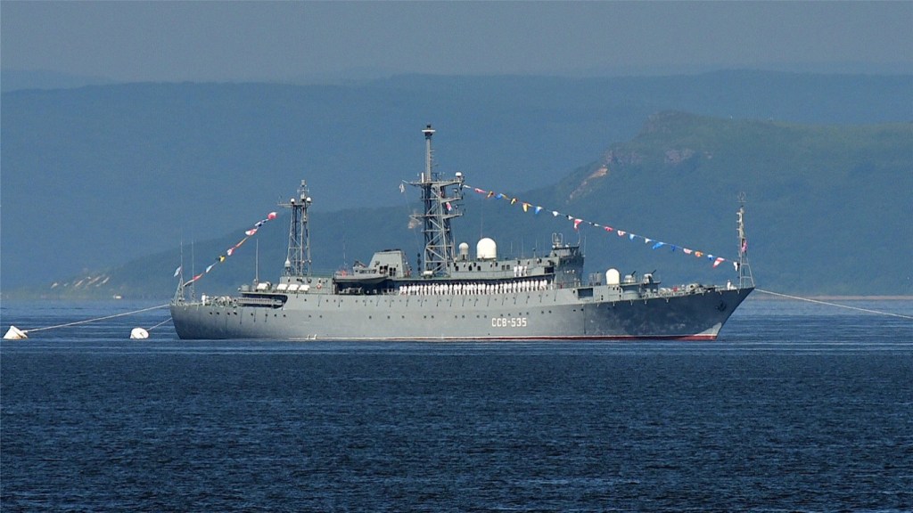 No, it’s none of those; it’s potentially much more threatening. It’s the KARELIYA: a Russian spy ship, spotted and identified by U.S. Coast Guard personnel about 15 miles south of the Hawaiian island of Oahu — outside U.S. territorial waters, but just barely — in late October.