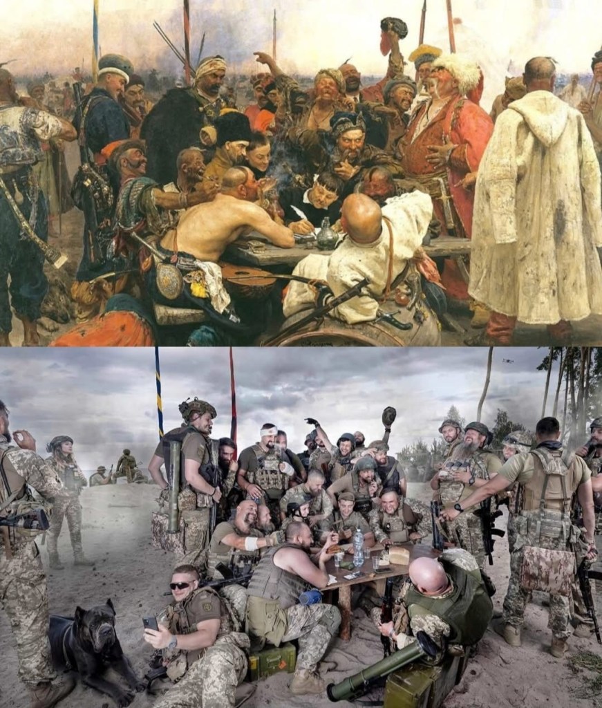 This composite photograph appeared in a Facebook post yesterday. Looking at the top picture, I thought I recognized the fine hand of one of the region’s most revered painters, the late Ukrainian-Russian Ilya Repin (1844-1930). A search revealed that it is indeed one of his works, titled “Reply of the Zaporozhian Cossacks” — such a fitting tribute to the people of today’s Zaporizhzhia, one of the regions so horribly decimated by Russia’s relentless assaults.