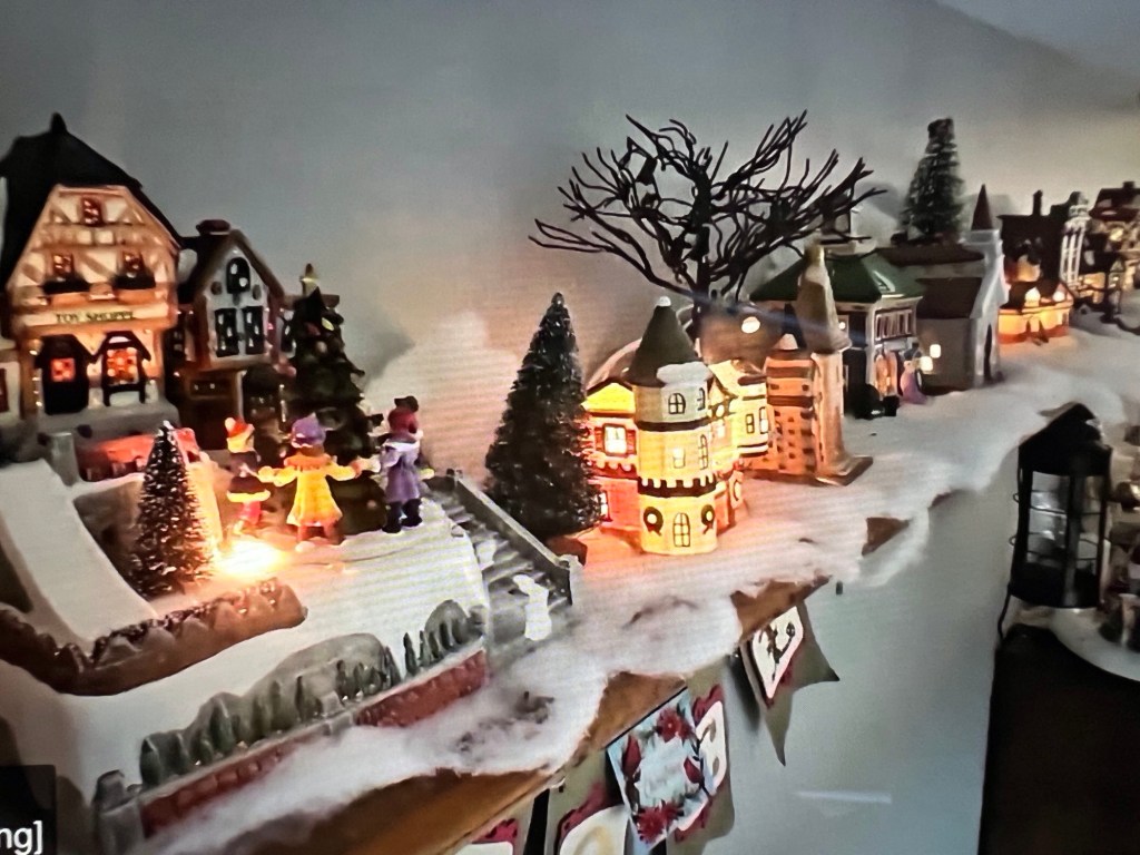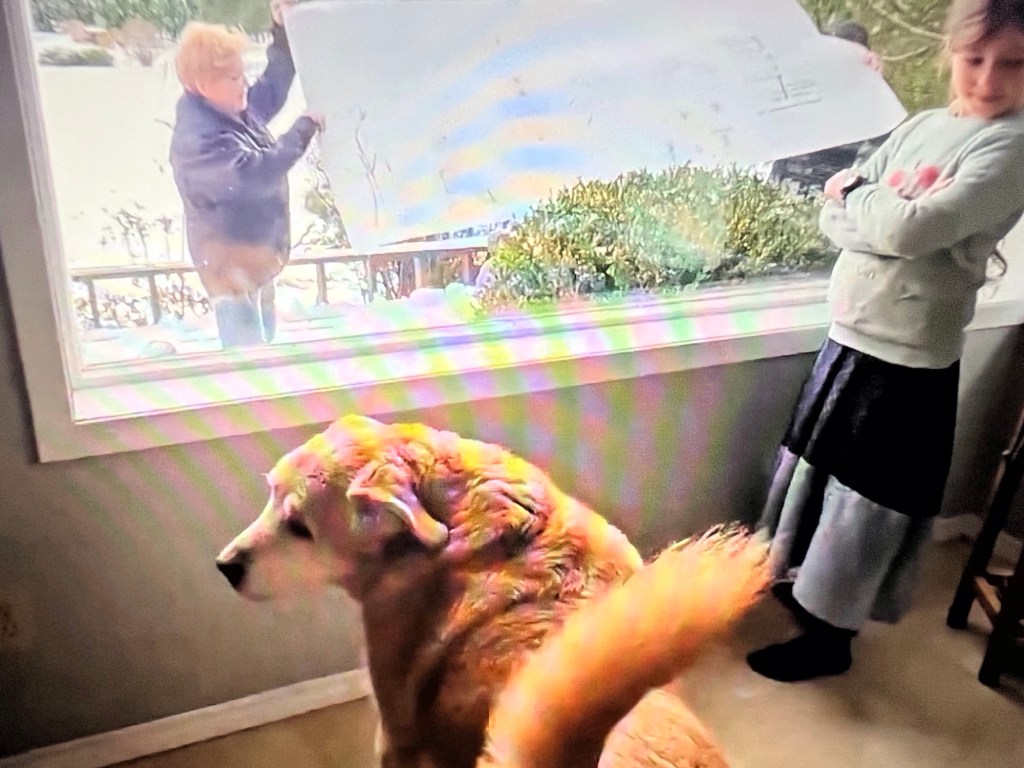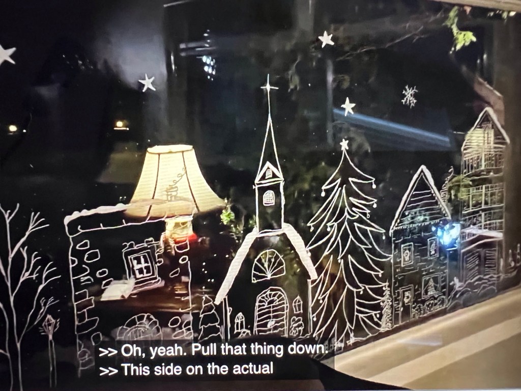 But of all the hustle and bustle, one activity — seemingly unique to this family — that stood out for me was a group art project organized by Grandma, who exhibited an unsuspected creative bent. For the two large windows in the living room, she made two huge drawings of a village on heavy-duty rolled paper. She and eldest granddaughter Cora then took the drawings outdoors, where they taped the perfectly-sized sheets, picture side facing indoors, to the exterior of the windows . . .