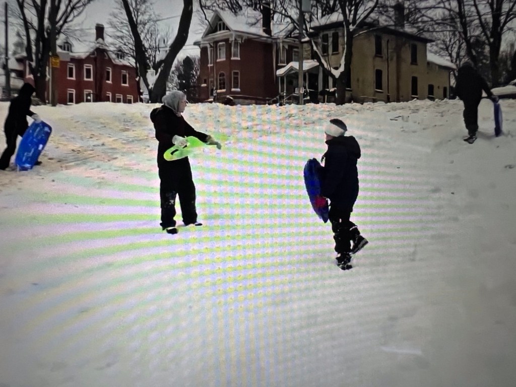 While Arend busied himself with carpentry and electrical work for his in-laws and one of his own brothers, Anneesa took the kids sledding on her favorite childhood snow hill . . .